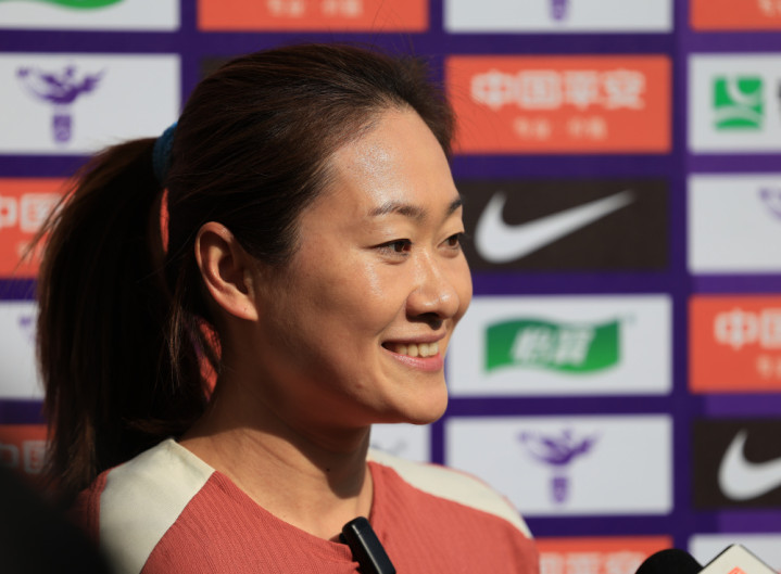 1月6日,中国女足队员吴海燕在场边领受采访。新华社记者毛念念倩摄