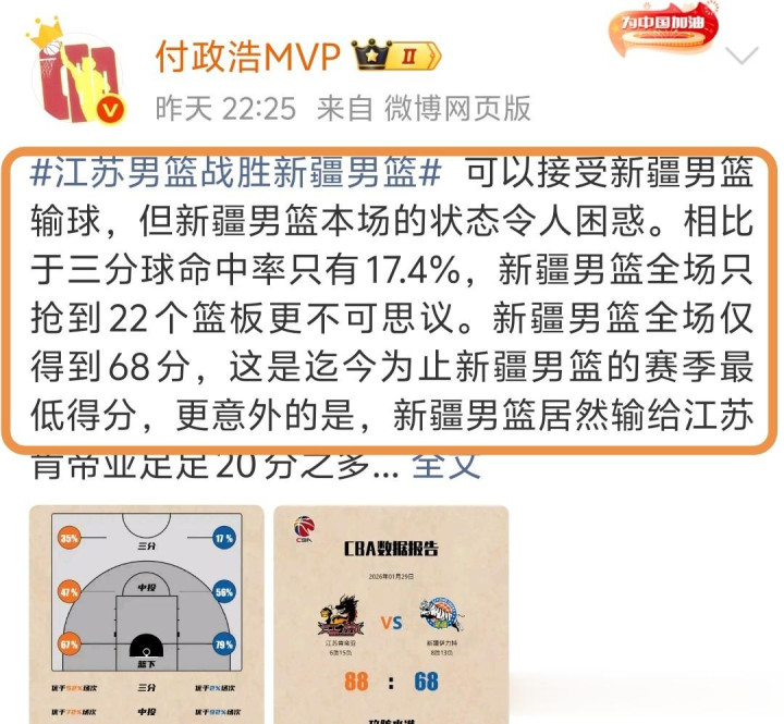 赛后,媒体东说念主付政浩MVP社媒,配文写说念:不错收受新疆男篮输球,但新疆男篮本场的气象令东说念主困惑。比拟于三分球射中率唯有17.4%,新疆男篮全场只抢到22个篮板更不行念念议。新疆男篮全场仅得到68分,这是迄今为止新疆男篮的赛季最低得分,更偶而的是,新疆男篮尽然输给江苏肯帝亚足足20分之多。