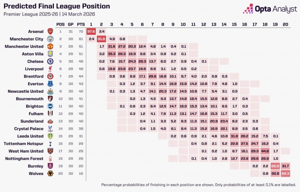 据OPTA愚弄超等缠绵机进行的10000次模拟,阿森纳夺得英超冠军的概率为97.6%,曼城夺冠概率为2.4%。至于其他英超18队,夺冠概率均为0%。
