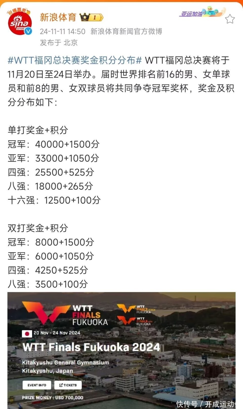 11月11日,将举办2024年WTT福冈总决赛男单、女单、男双、女双的比赛,期待国乒球员赢得好得益。