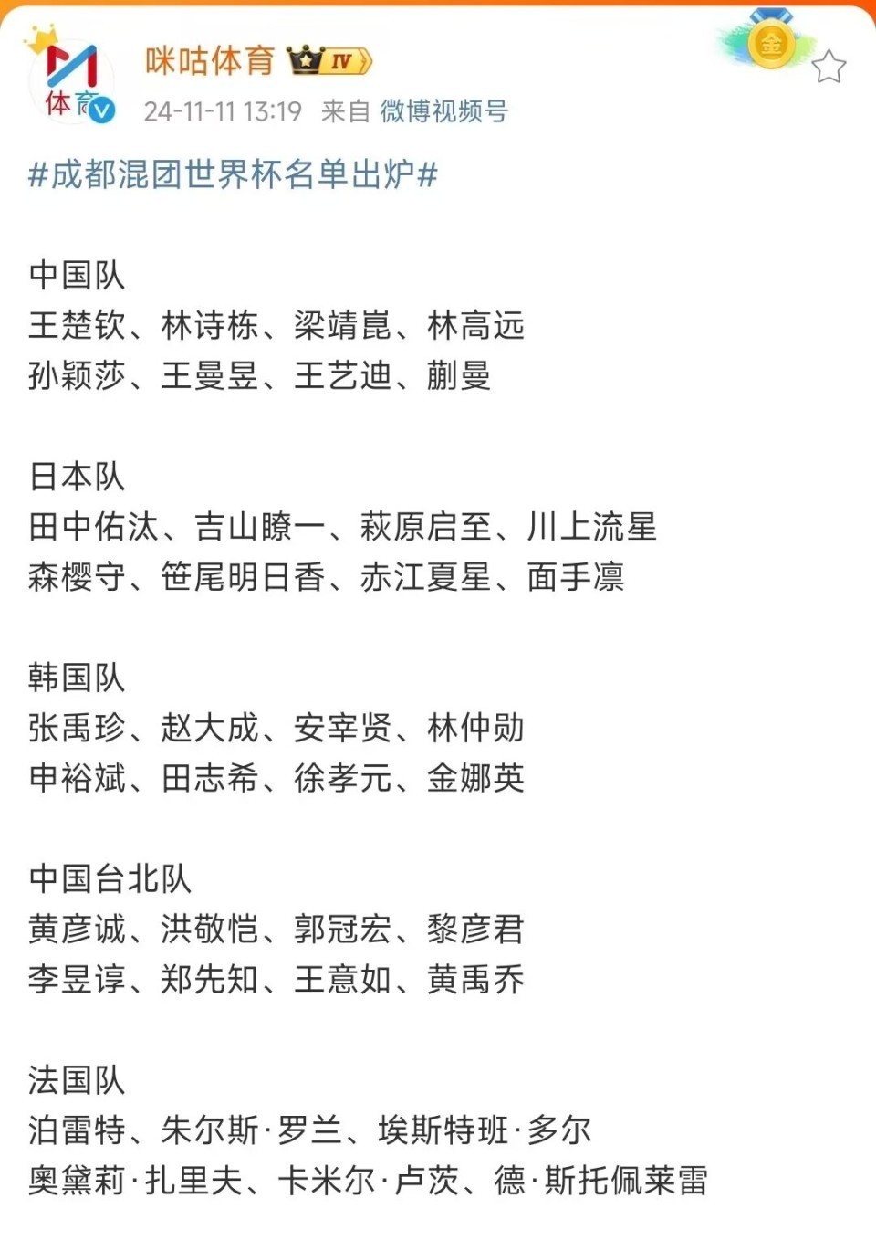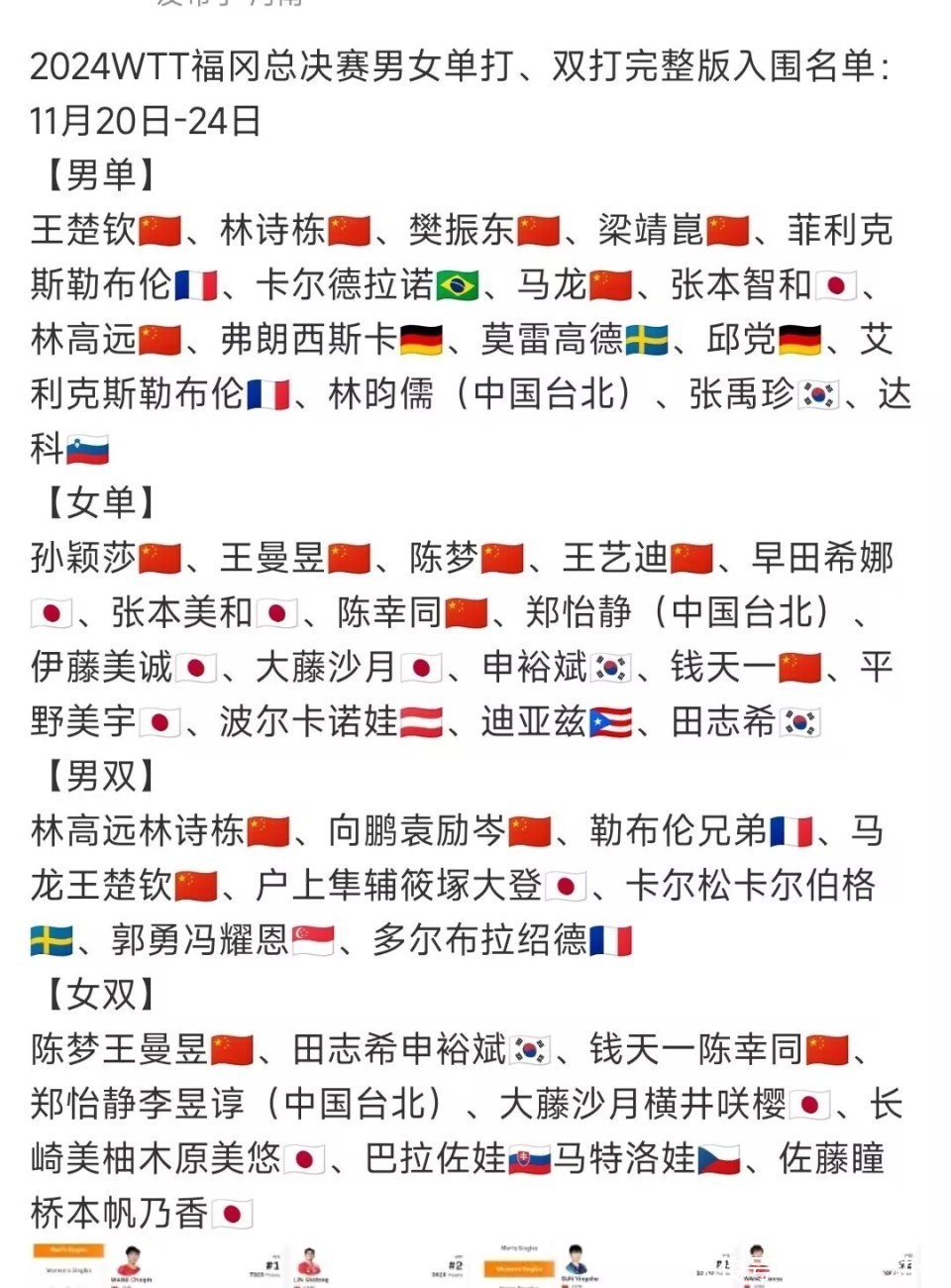 成王人混团寰宇杯名单出炉,日乒莫得派出主力投入,张本智和、张本好意思和莫得投入,其他戎行也不是主力球员参赛!